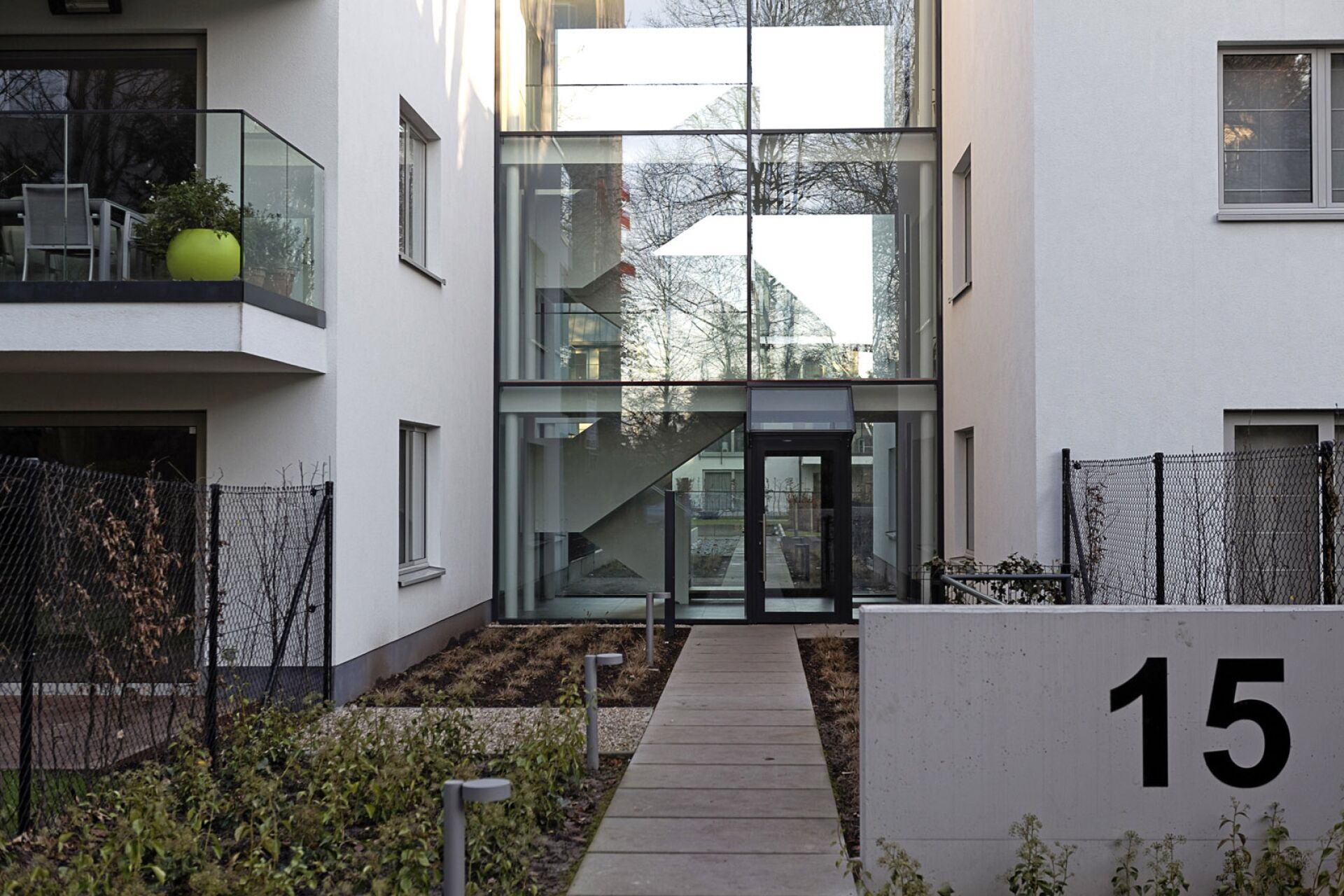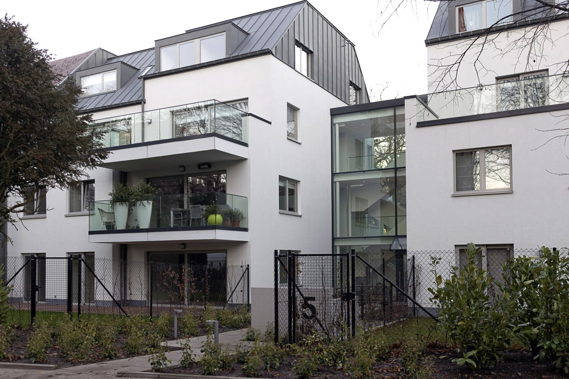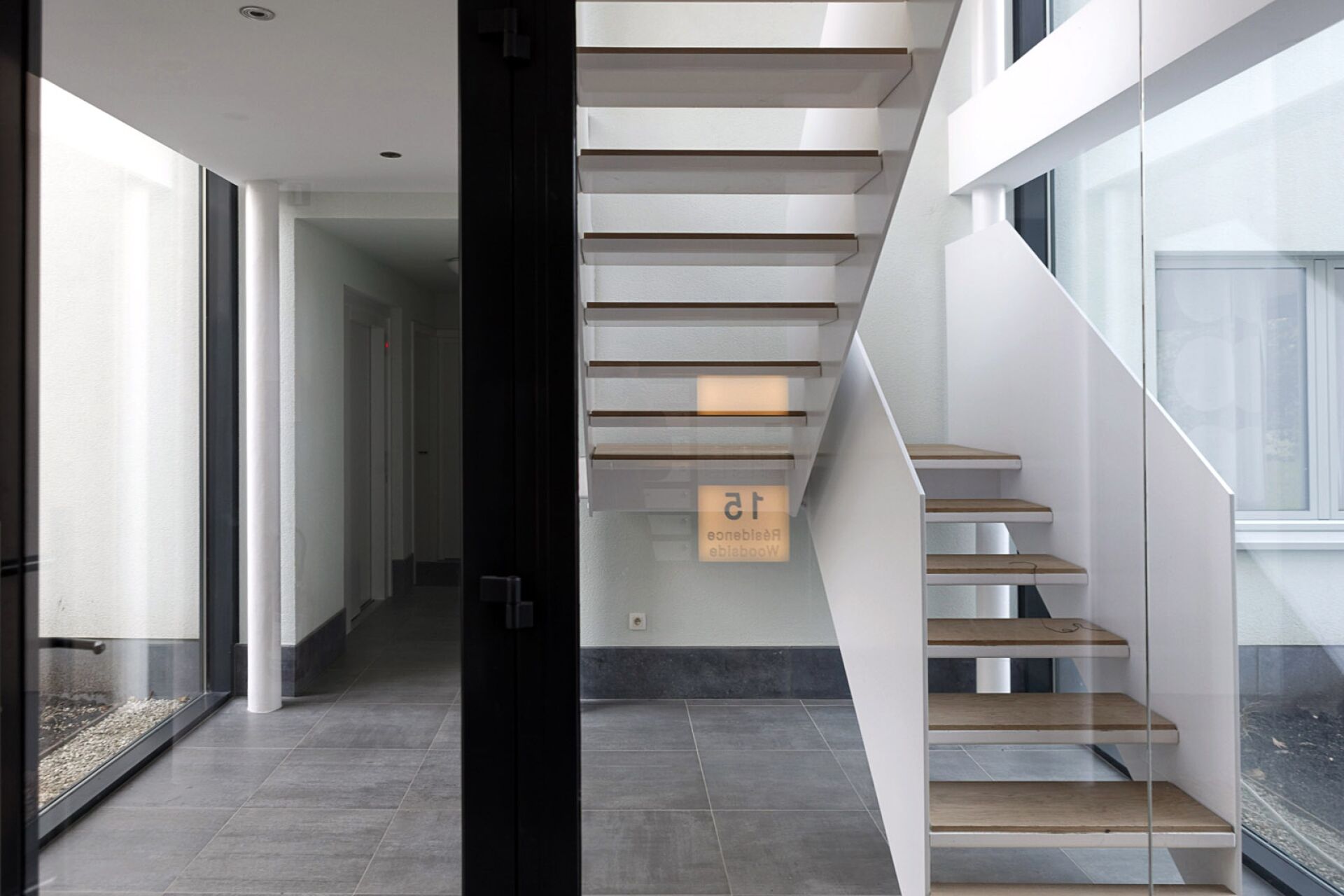 A l'avant, construction de 2 villas à appartements avec une jonction pour le hall d'entrée et escaliers intérieurs.