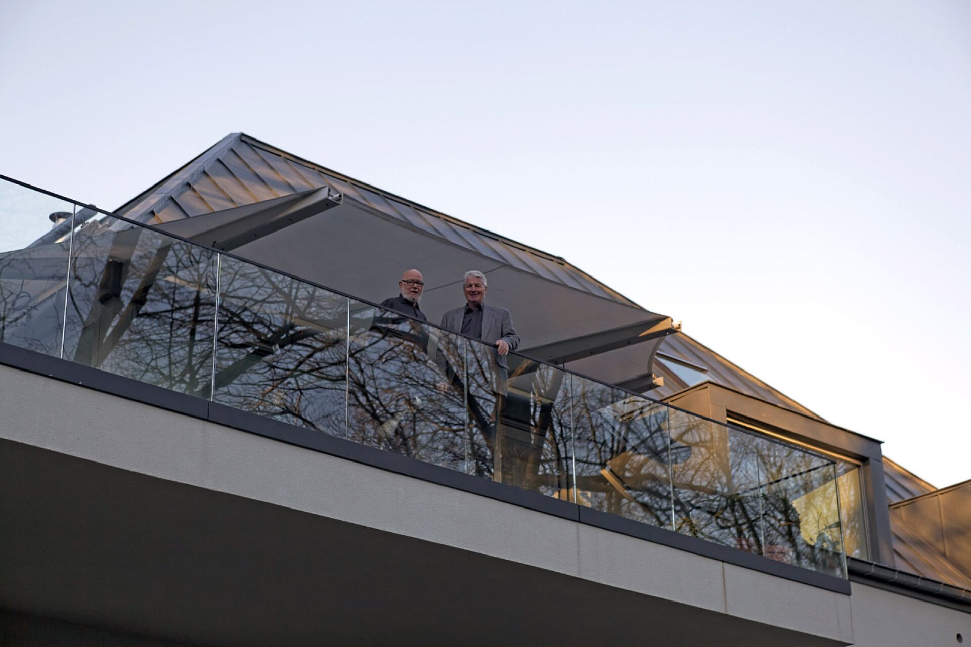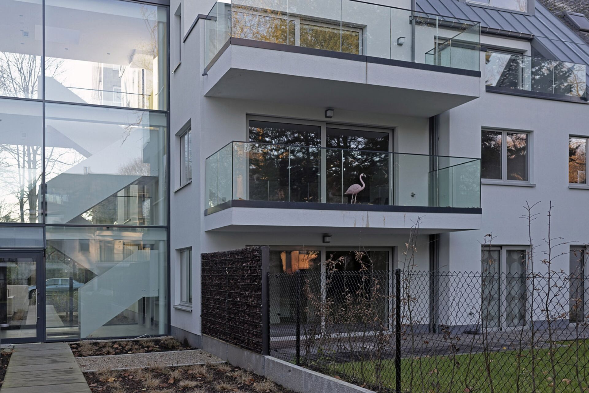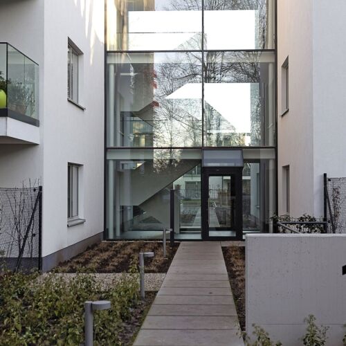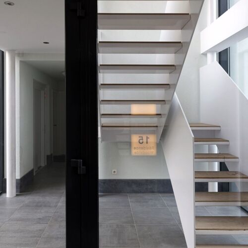A l'avant, construction de 2 villas à appartements avec une jonction pour le hall d'entrée et escaliers intérieurs.